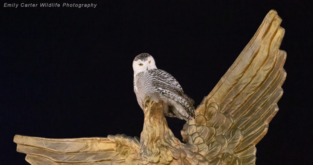 As the winter of 2022 was the most recent irruption year; Snowy owls were found along beaches, at airports, in agricultural fields, and even around urban areas. One of these owls, “The Duchess,” made international headlines, choosing Union Station in Washington D.C. as her hunting grounds. Every evening when night enveloped the city, she silently swooped down and posed beautifully upon the flag poles as well as the Columbus Fountain in the garden in front of the station.